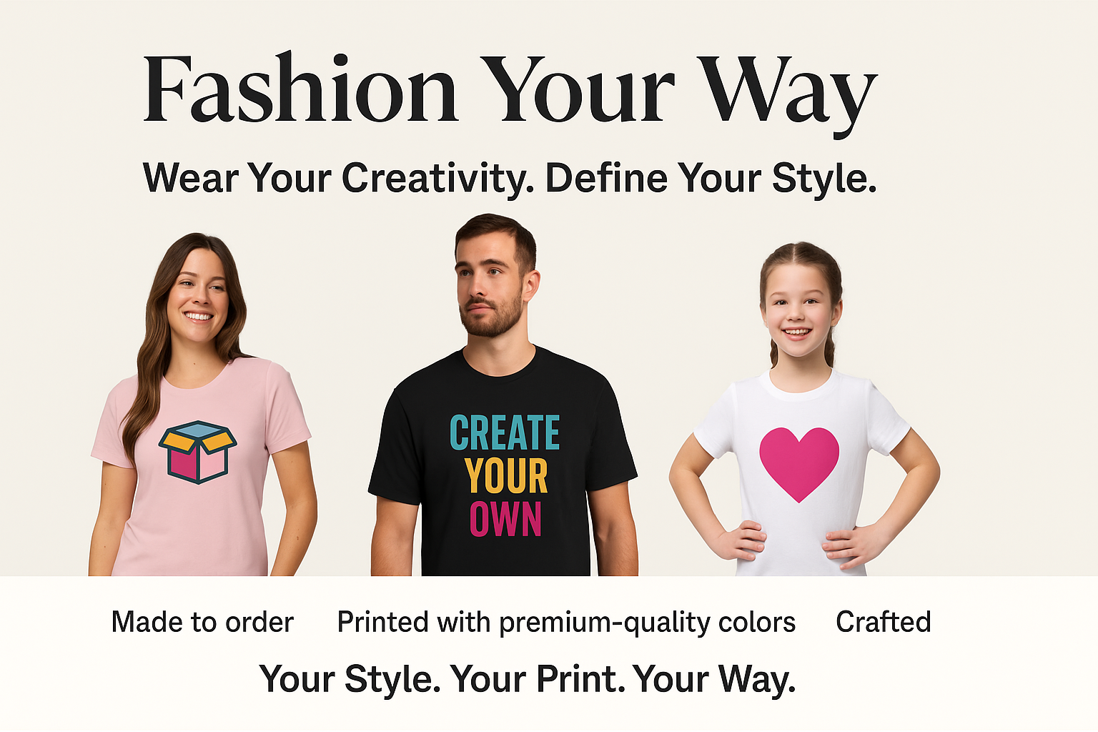 At Fashion Your Way, we bring your imagination to life through custom-printed clothing for men, women, and kids. Every product is made on demand with premium quality and care — no bulk, no waste, just fashion your way. Express your style, wear your creativity, and make every outfit uniquely yours.